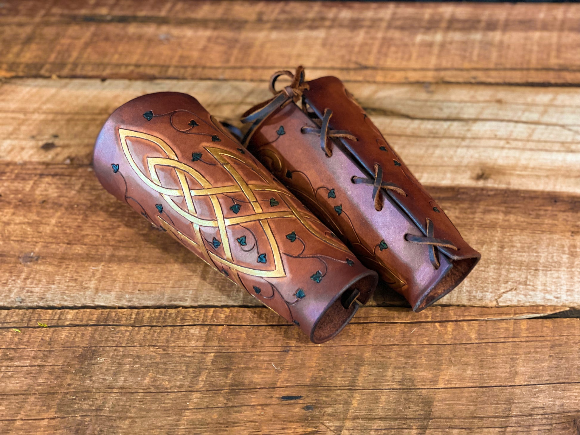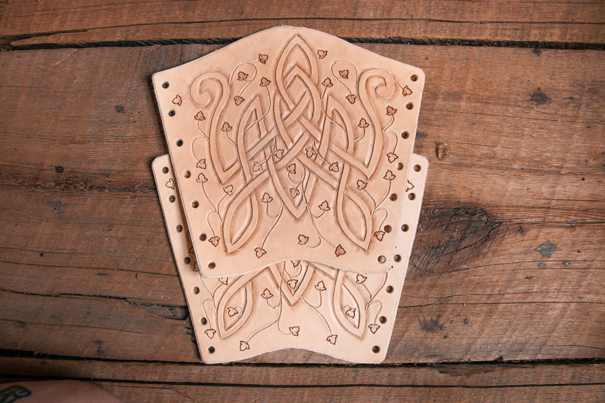 The bracers are sturdy, made with 1/8 thick veg tan leather, and is very adjustable with leather lacing. All the holes are pre-punched, all you have to do is customize and assemble!