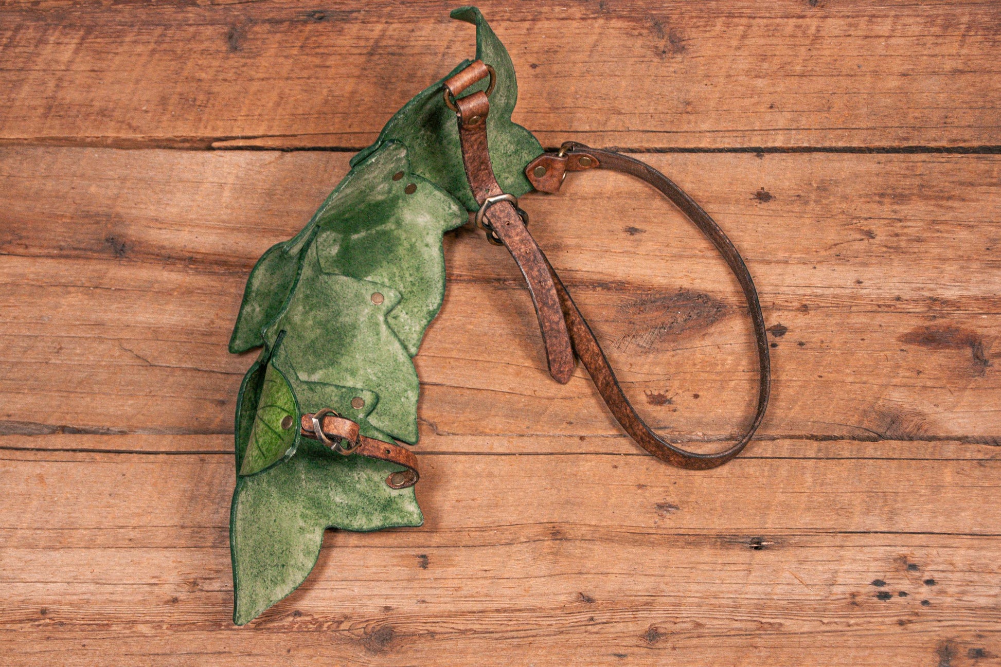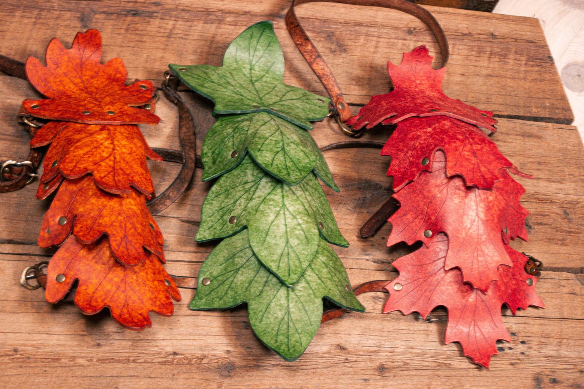 Available in Maple, Ivy or Oak, this pairs perfectly with our Leaf Cinchers, Leaf Corsets, or Lunar Leaf Cinchers. We currently do not have photos for the option without the Collar, however without it and with the Laces attachment, this piece can combine with our Dryad Epaulettes, Gorget or Clavicle Vest.