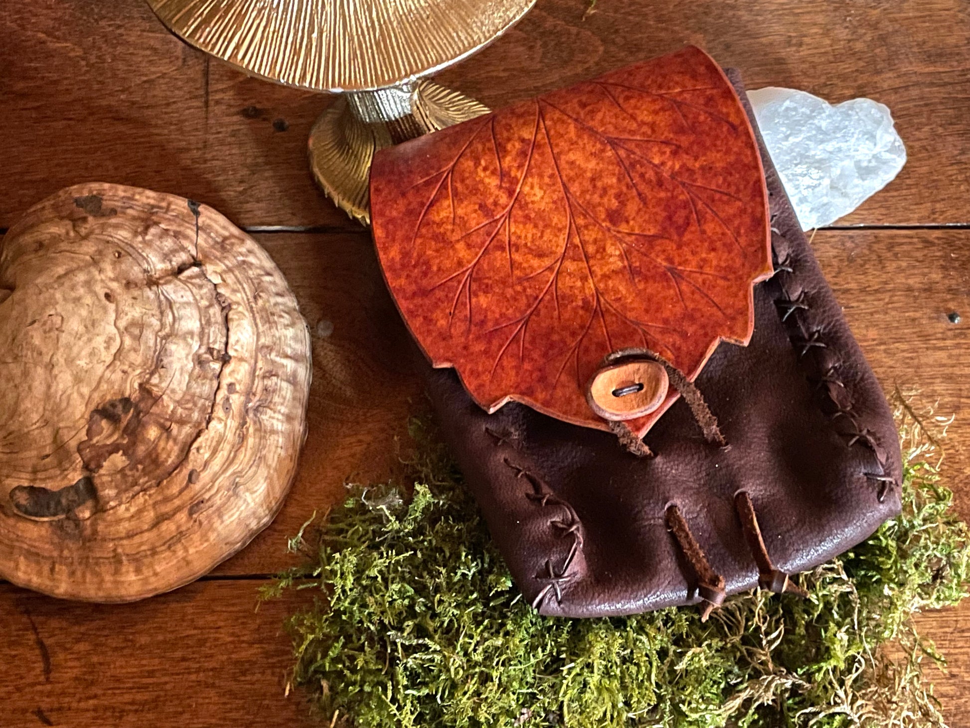 For Elves, Fairies, Druids, and other woodland dwellers. The perfect pouch for carrying acorns, mushrooms, tiny sketchbooks, or other less magical things, like phones and wallets.