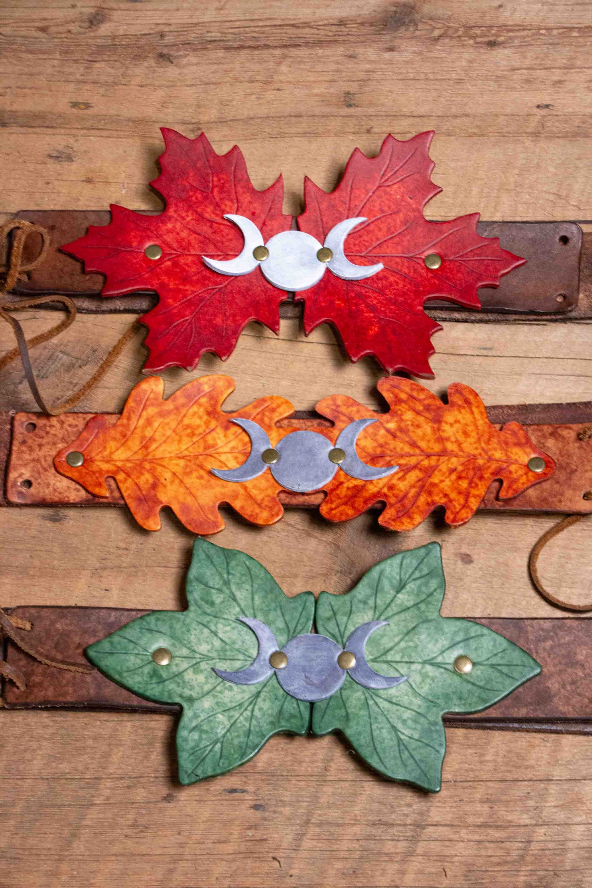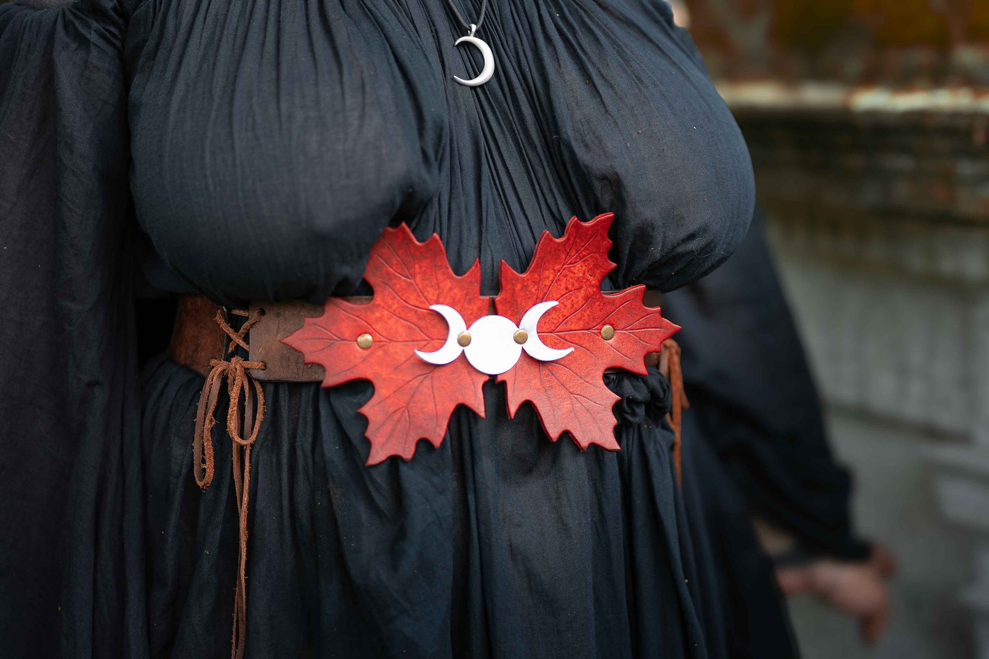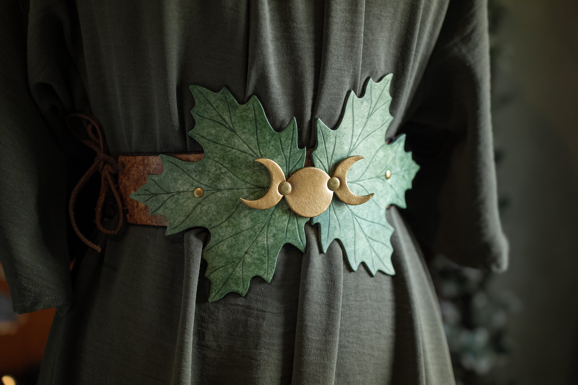 This belt is a beautiful combination of Fae and Witch, with a Triple Moon at the center, over a pair of maple leaves. Adjustable with two laces on either side, the belt will be custom sized to your waist measurement.
