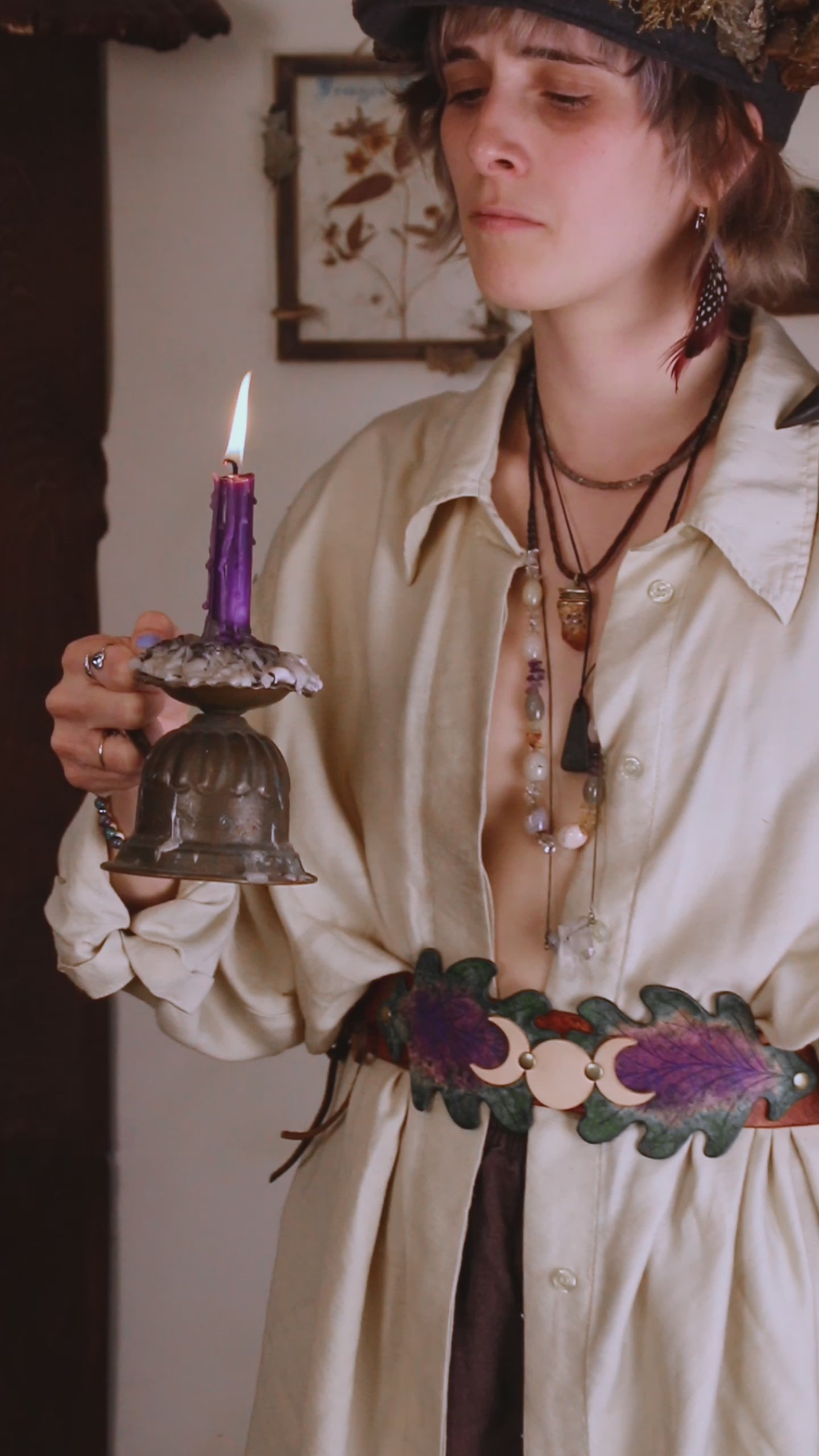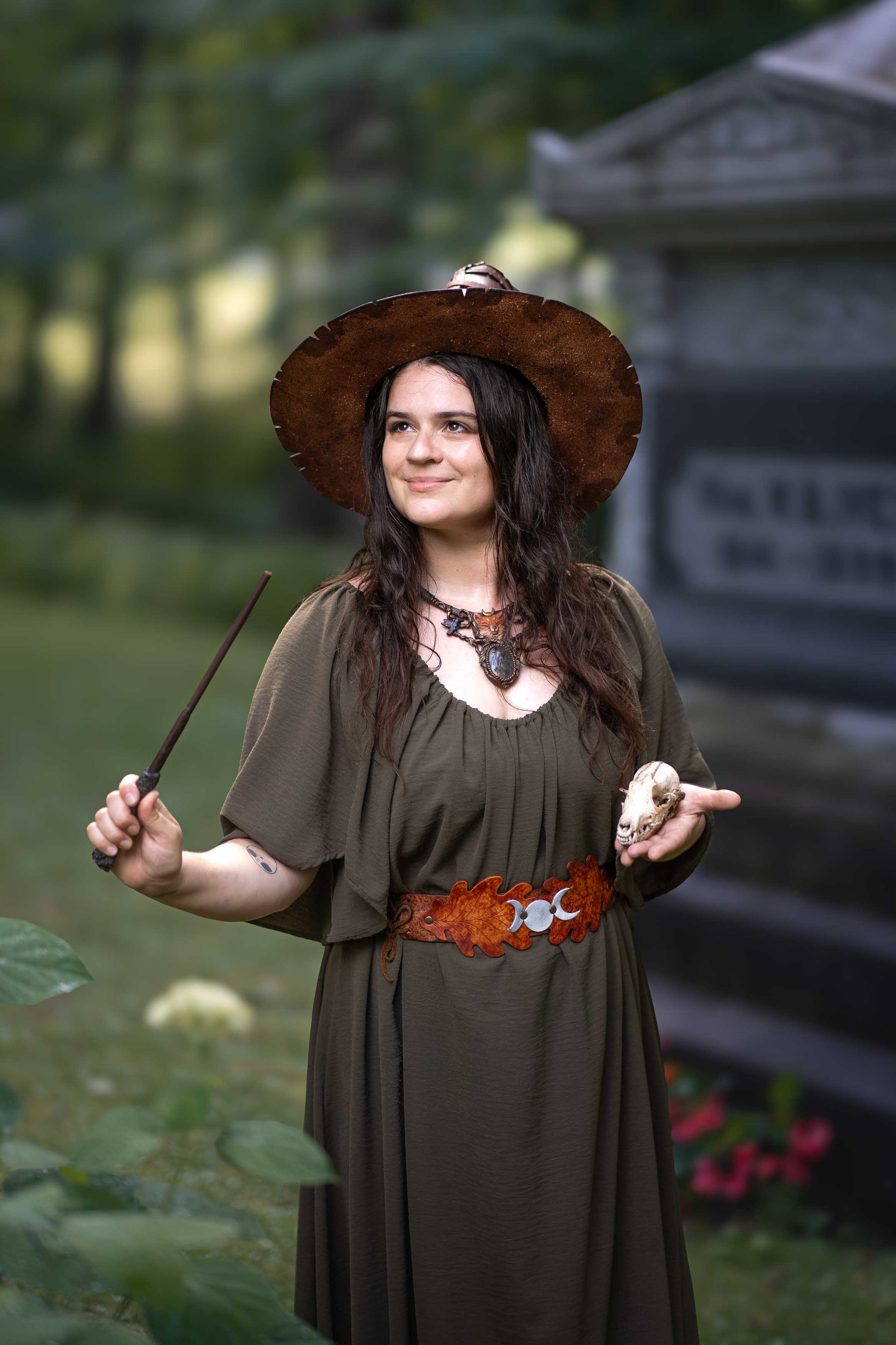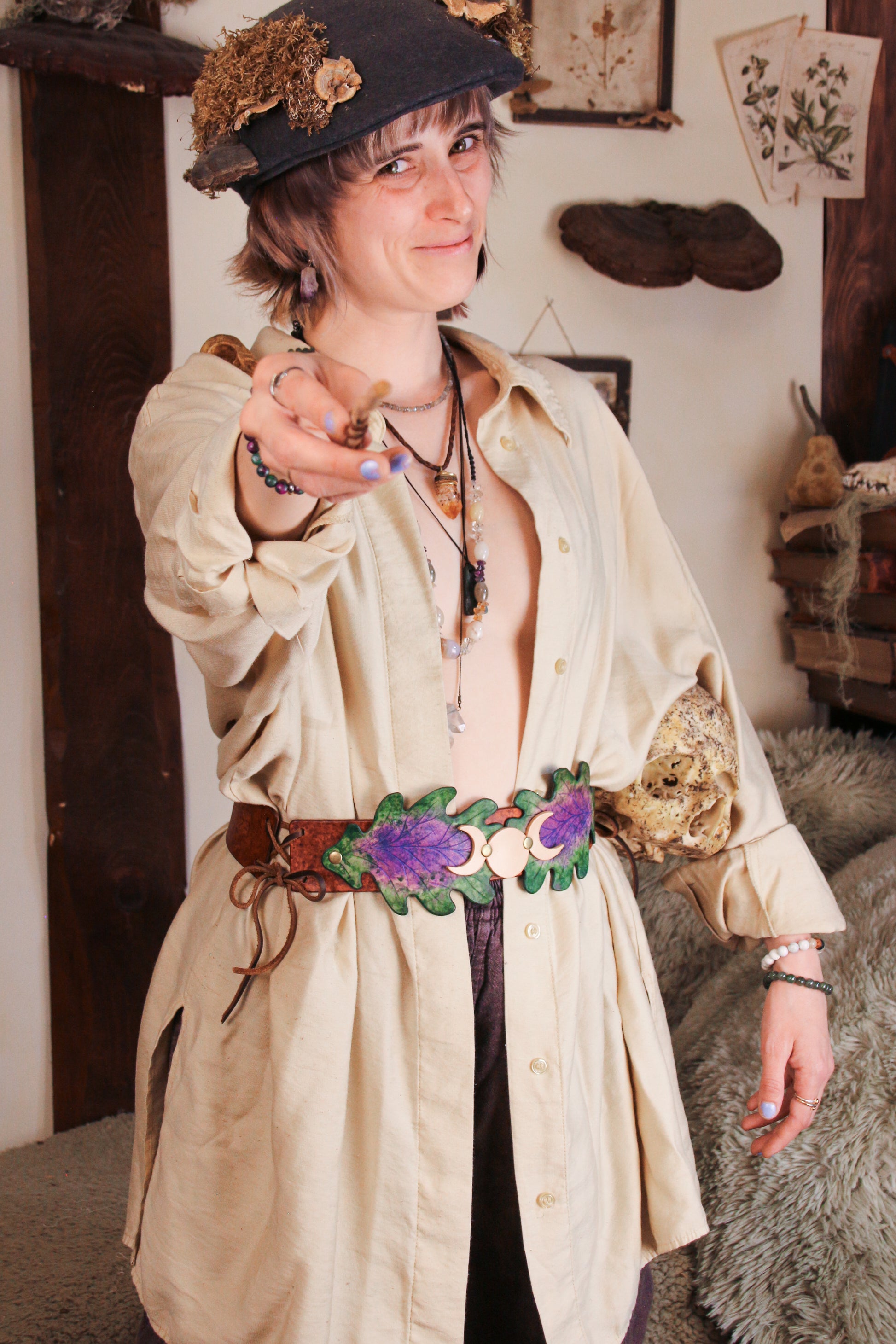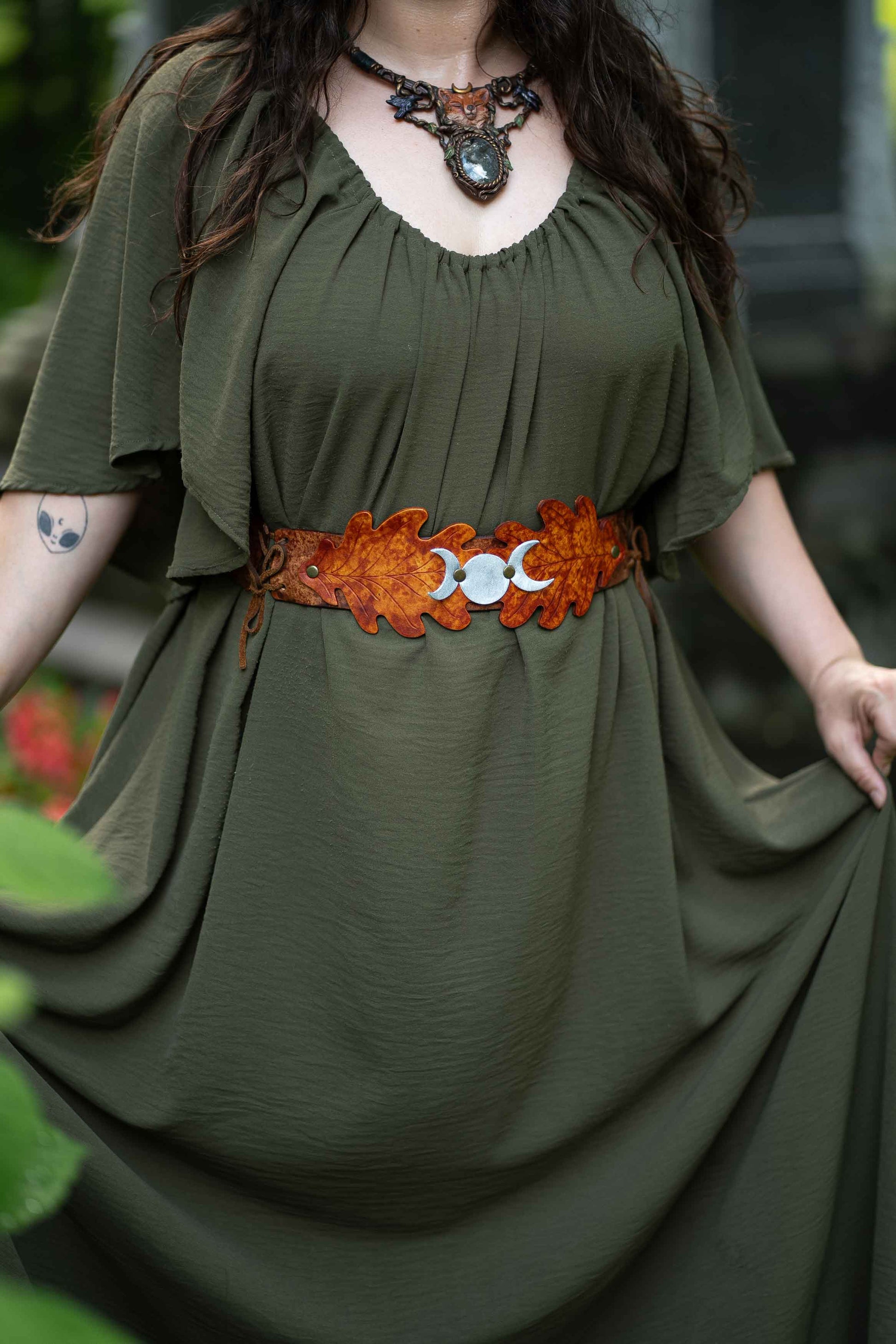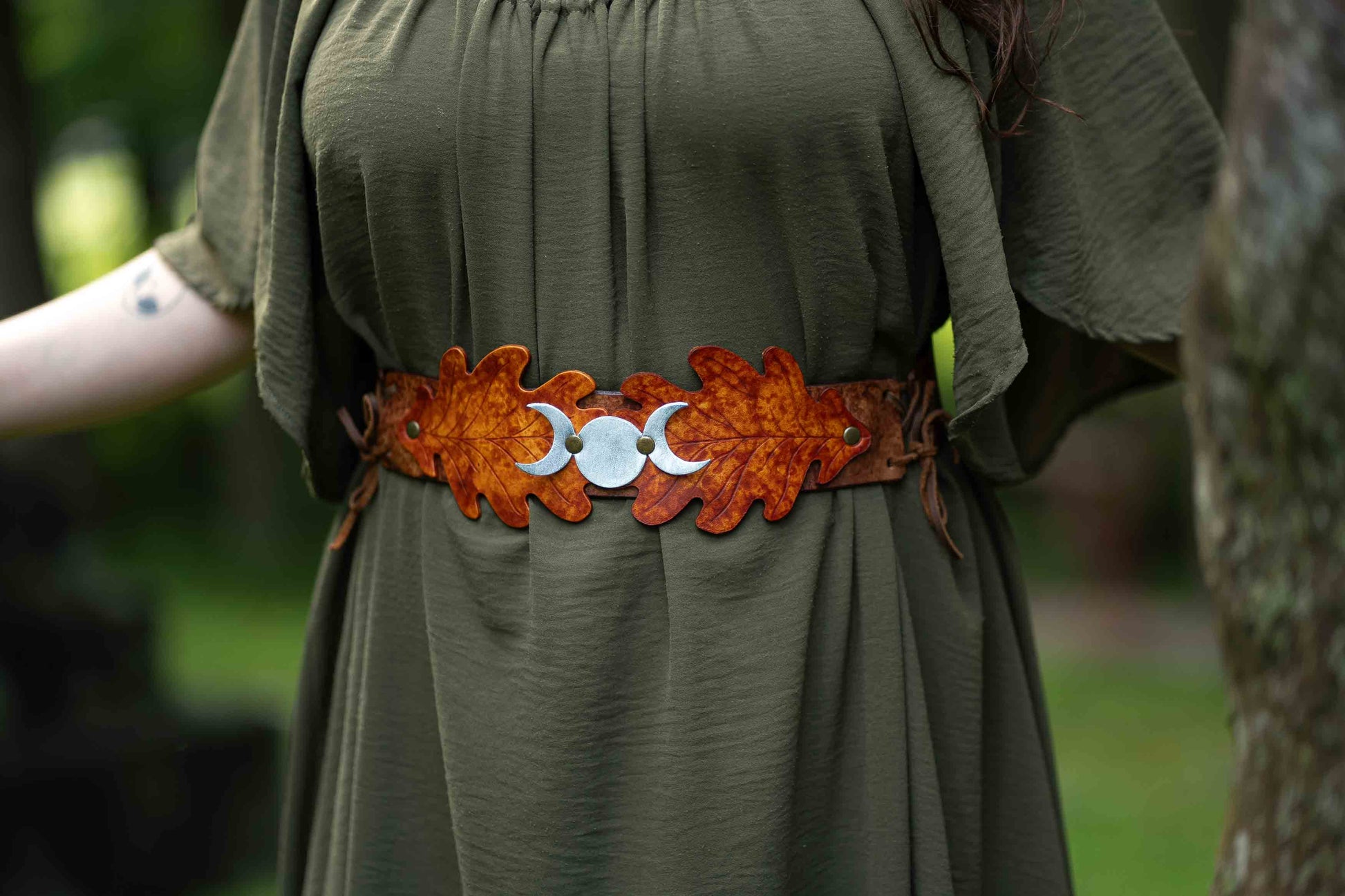 This belt is a beautiful combination of Fae and Witch, with a Triple Moon at the center, over a pair of oak leaves. Adjustable with two laces on either side, the belt will be custom sized to your waist measurement.