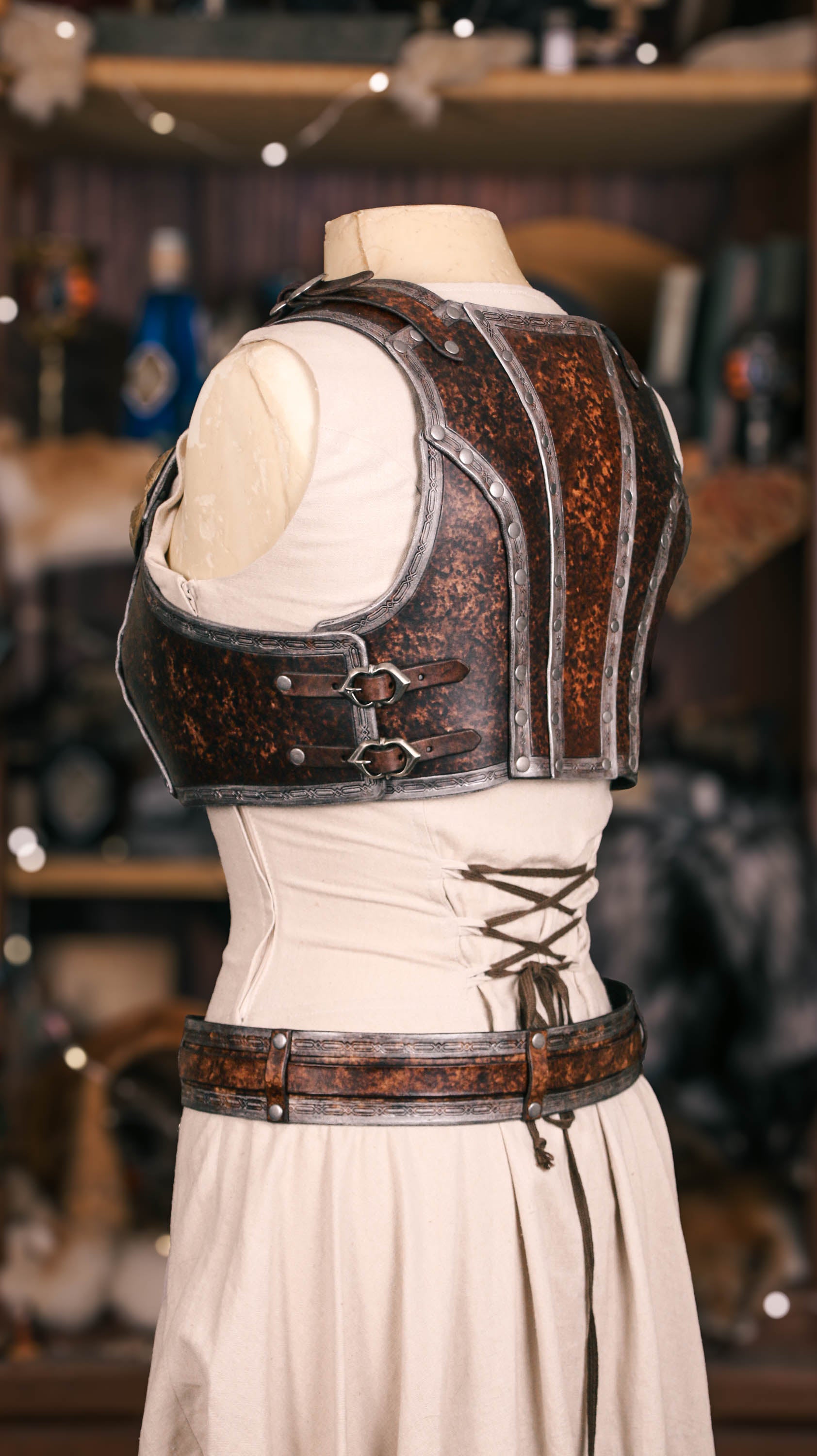 This unisex half-breastplate (or demi-cuirass) is high customizable for different cup sizes and underbust circumferences! We can easily go from Flat Chest all the way up to a DD cup. The mannequin is depicted with a C-Cup. Please inquire if you have a special sizing request or if any of the measurement selections are unclear.