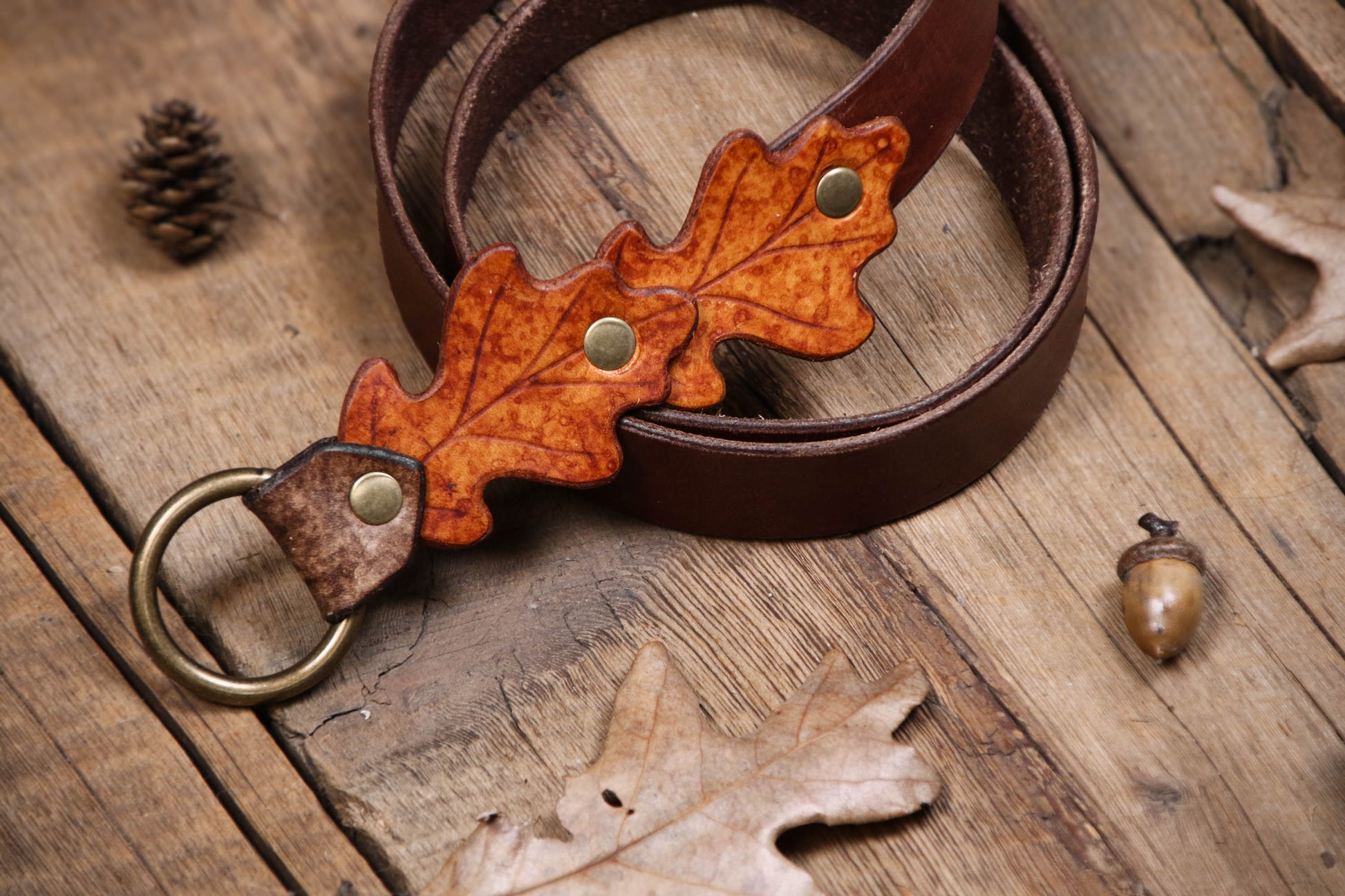 This belt comes with a blank end tip as standard, but you can add a leaf design to the end for a small additional cost.