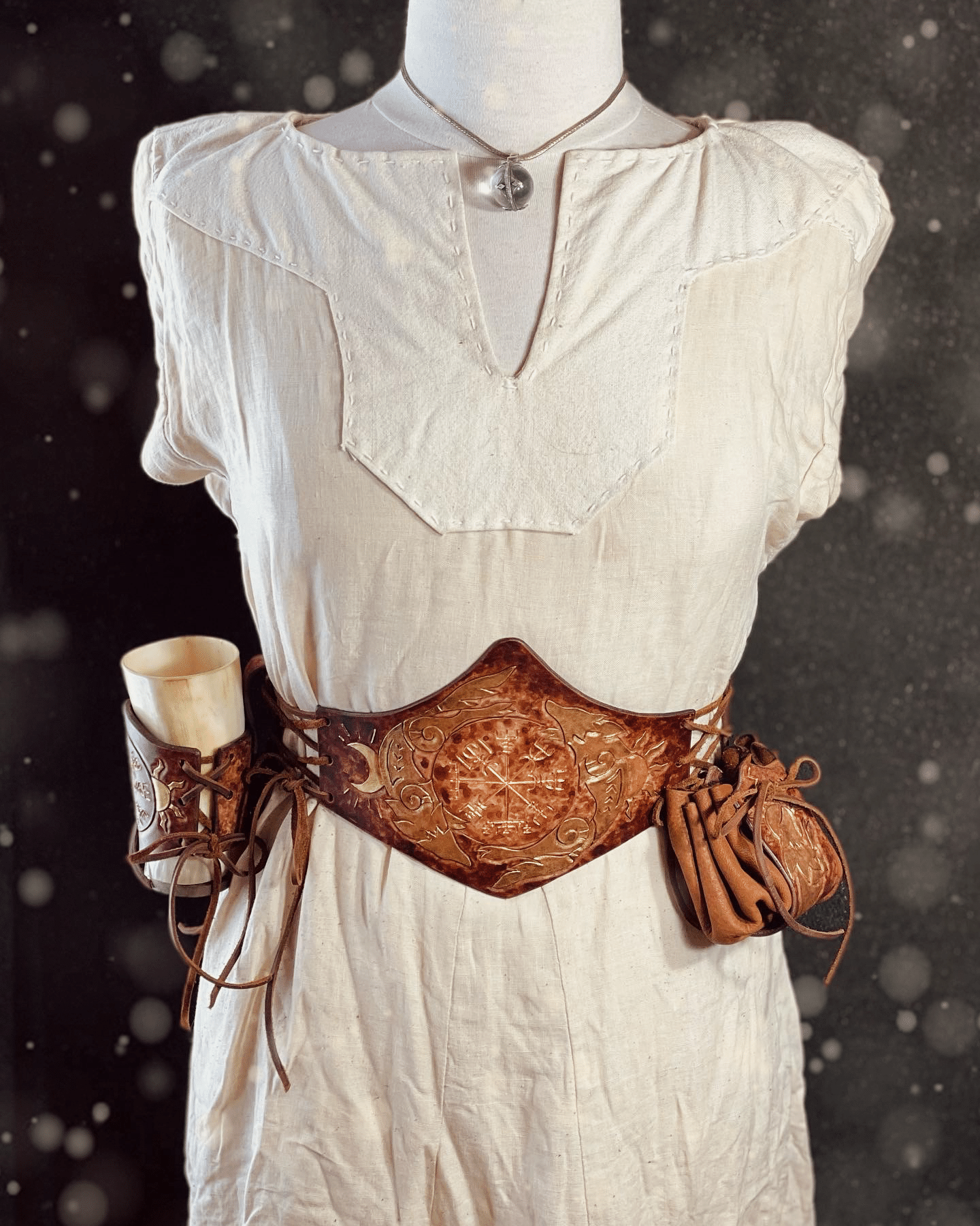 Here the sun and moon frame the Helm of Awe, Vegvisir, a magic symbol adorning the helmets of Odin’s army.