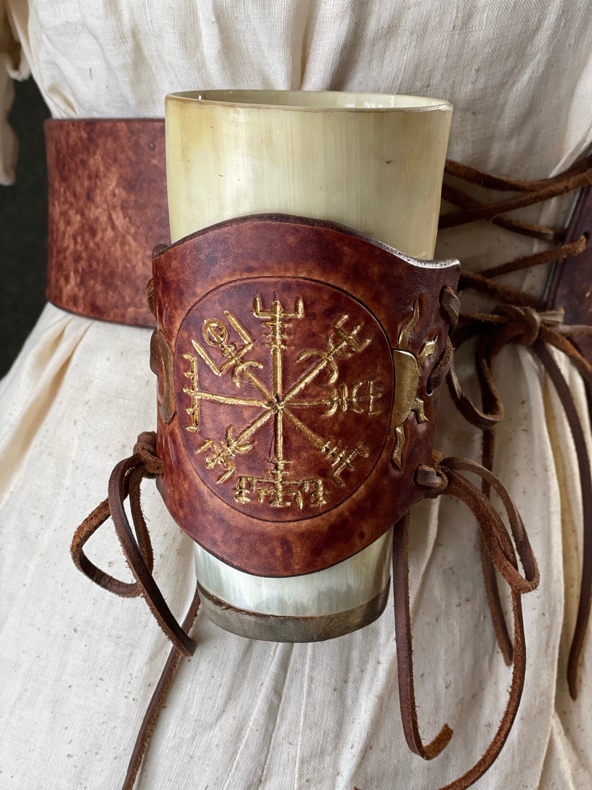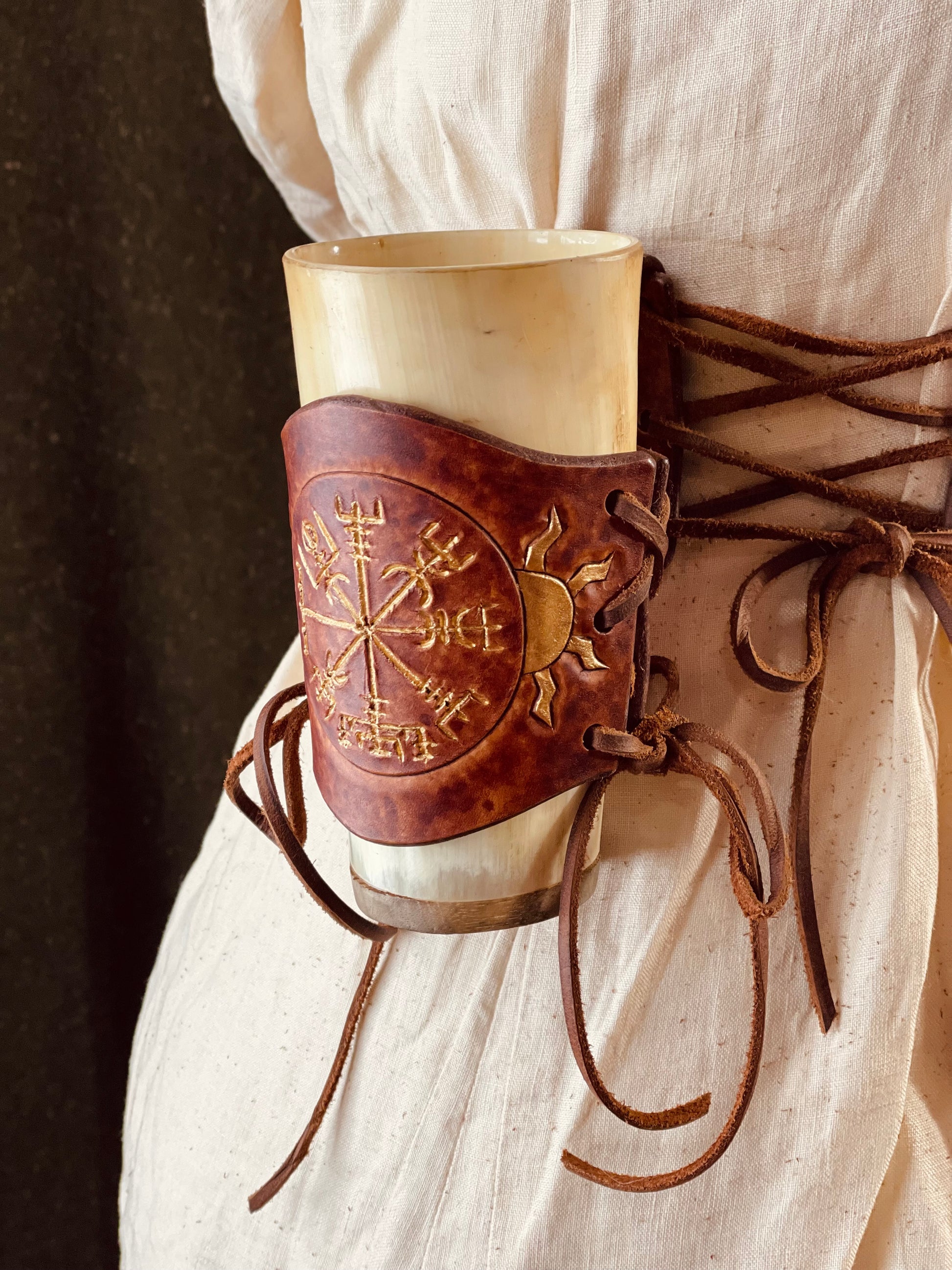 This horn holder has laces on each side to better adjust to whatever size your horn is, or even switch between horns. A minimum of roughly 3” diameter.