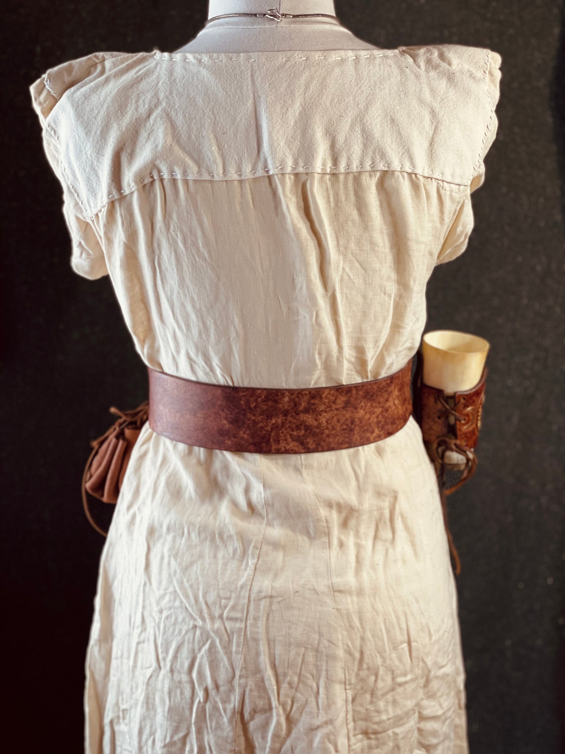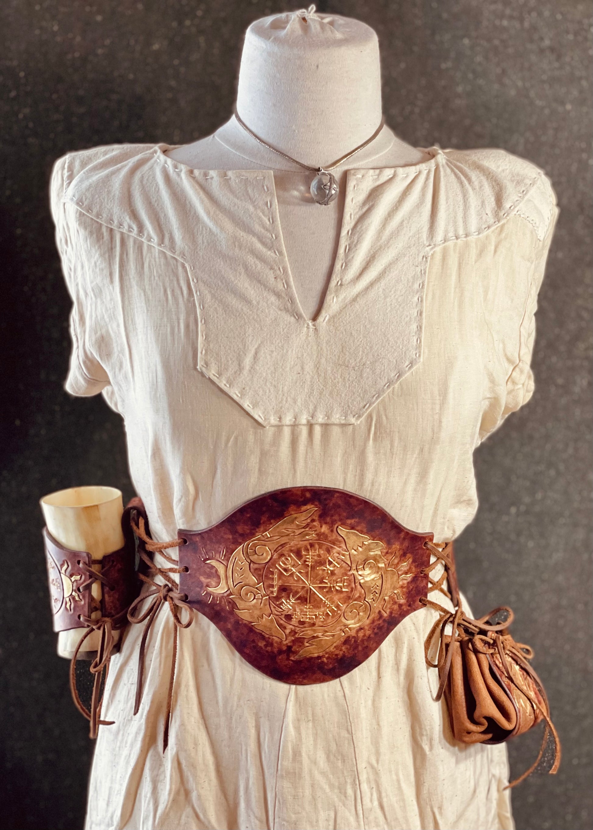 This belt is perfect for renaissance faires or medieval festivals; LARPs, or Last Kingdom costumes. It's a classic belt that goes great over flowing dresses, tunics, or even chainmail!