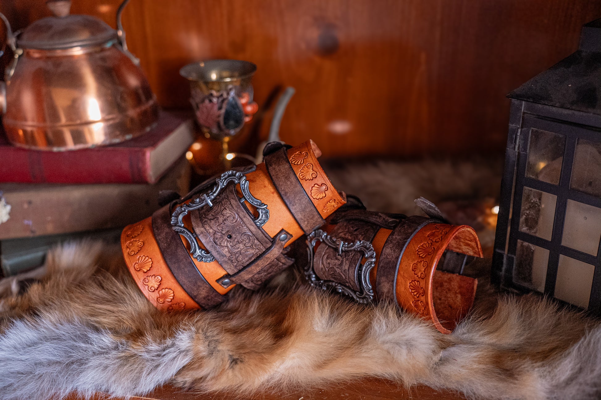 Modeled by @danikasdaydreams wearing Weathered Light Brown with Medium Brown Belts. Bracers on wood background are Weathered Dark Brown with Black Belts.