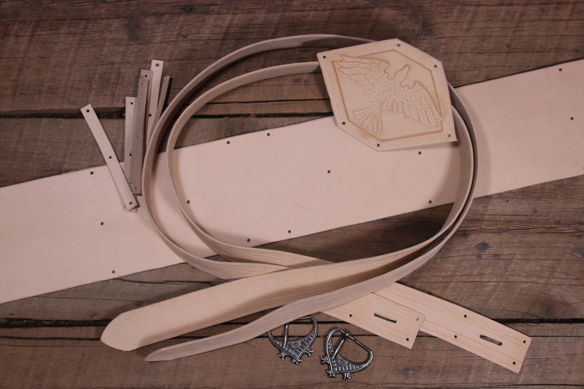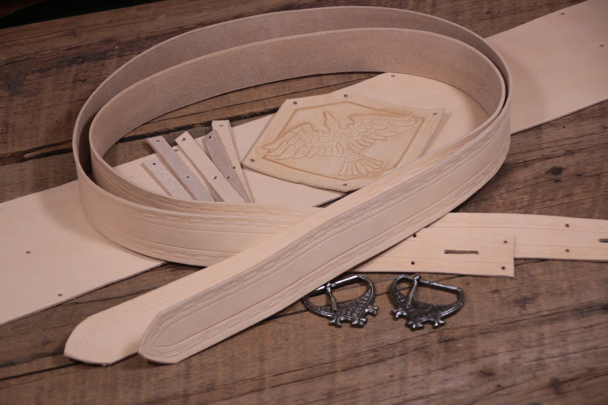 This piece is our take on the classic double belt waist armor for many viking, norse, and barbarian costumes. Featuring the raven design on the back, and two beautiful buckles from Rawblade on the front (or perhaps, vice versa, if you choose to wear it the other way).