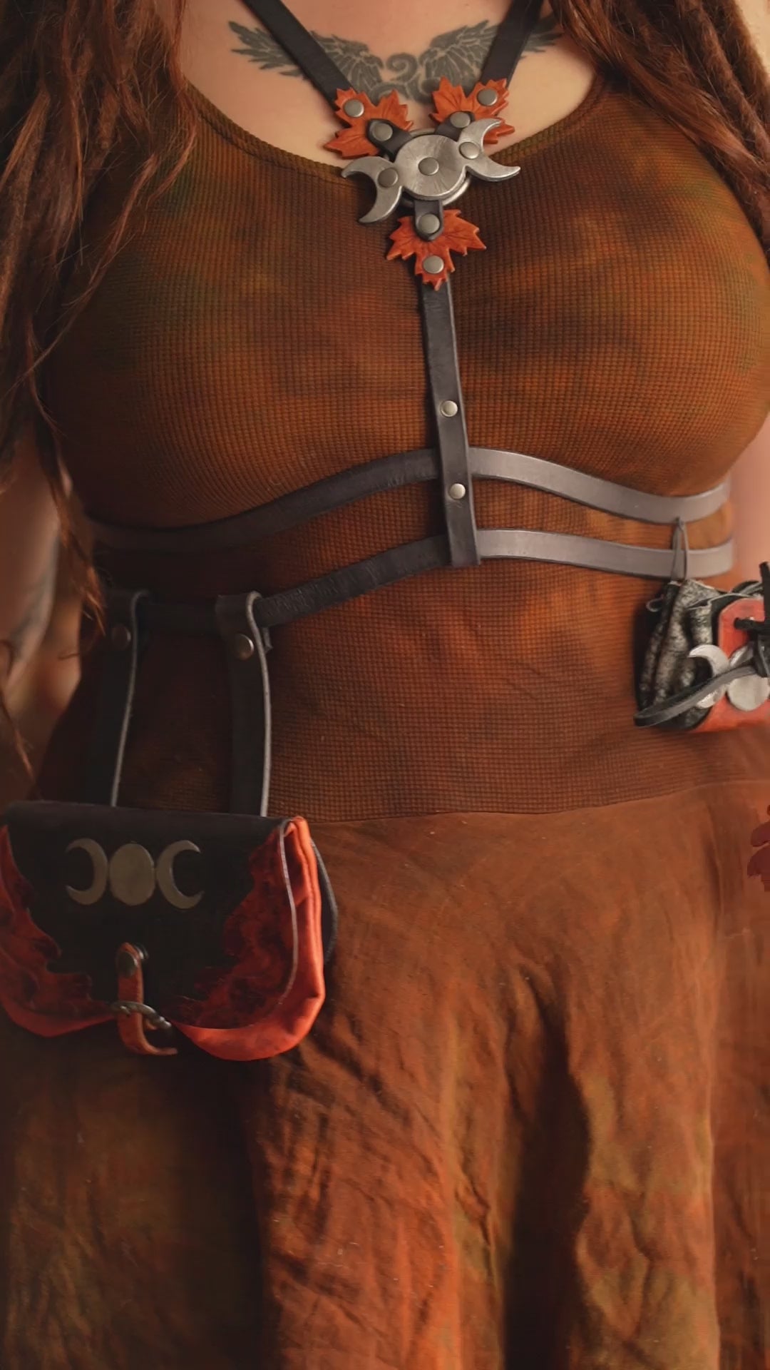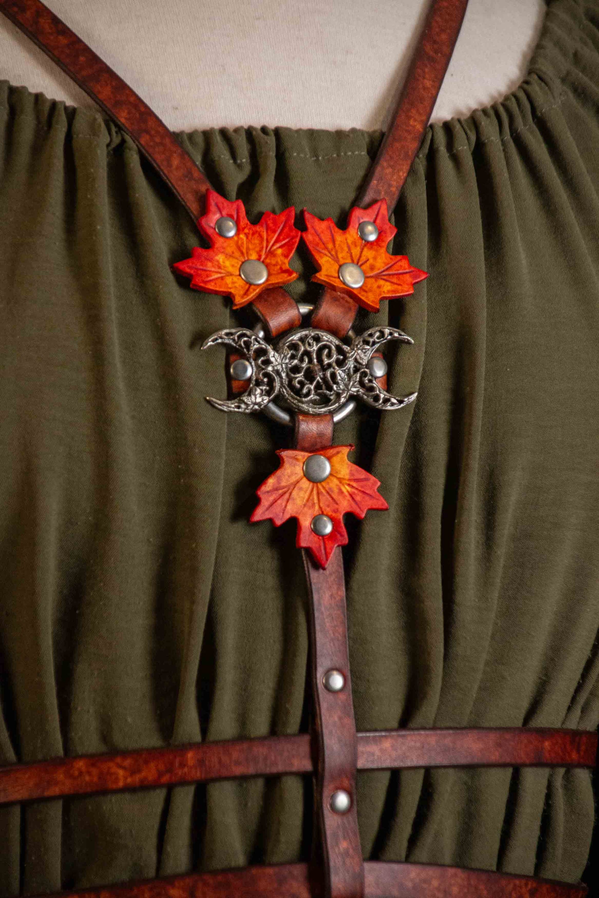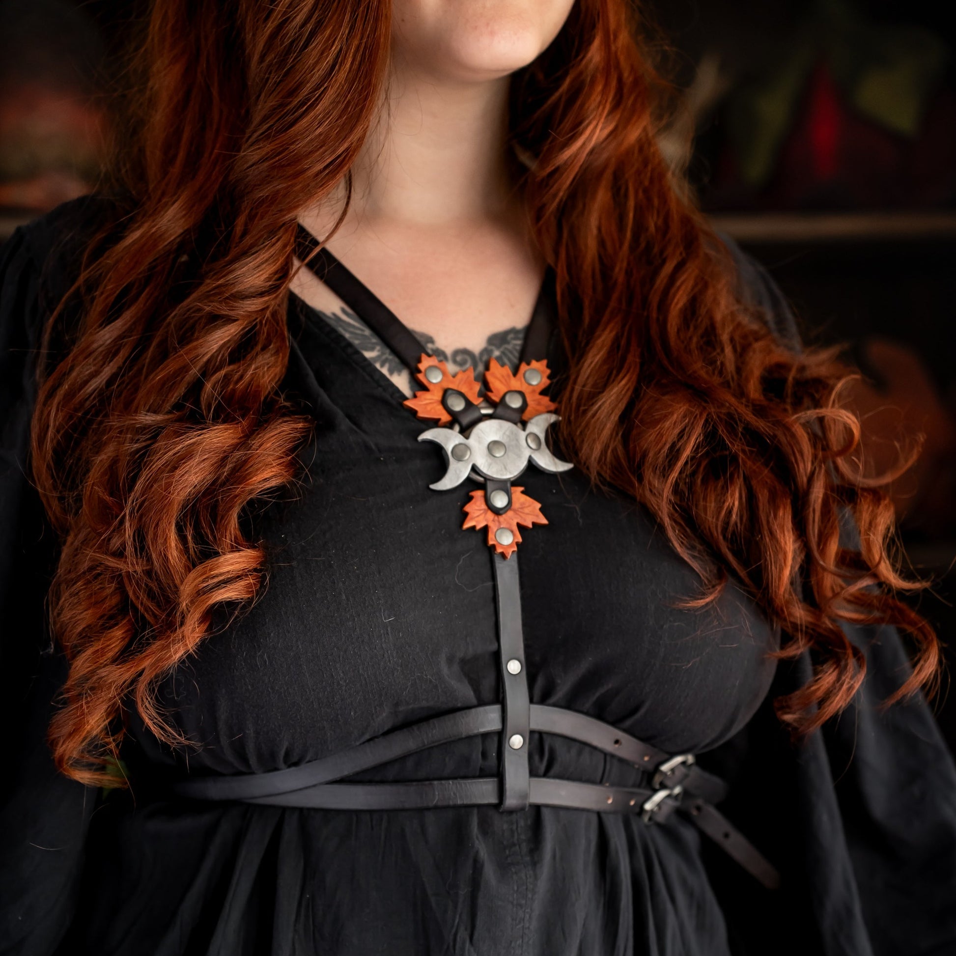 Ajoutez une touche d'éclat à votre garde-robe de sorcière ou de sorcier avec ce harnais qui peut être porté de deux façons ! Tu peux porter la forme en Y devant, ou derrière, avec les deux côtés comportent la triple lune, symbole d'Hécate : Mère, Jeune Fille et Vieille.