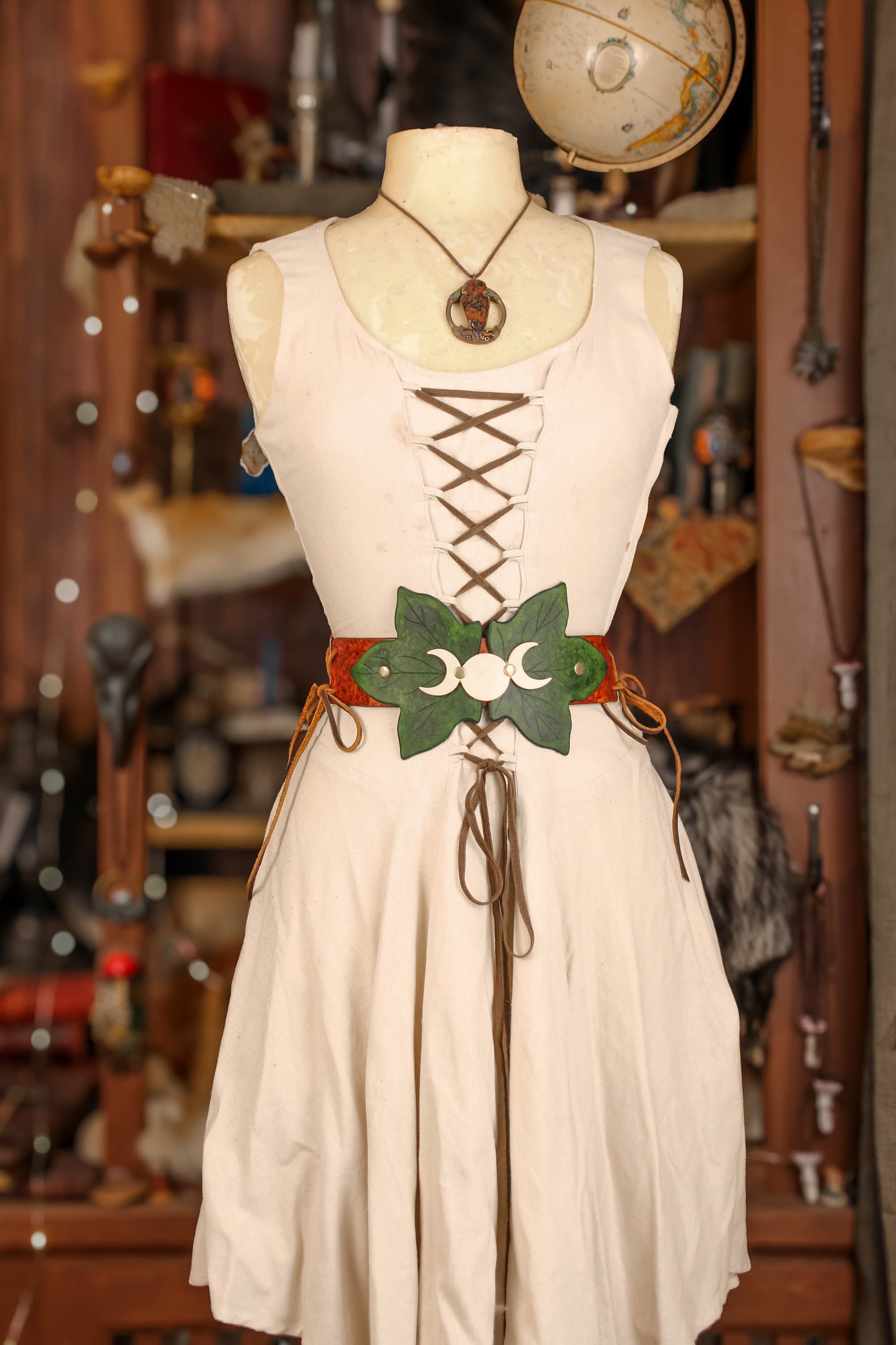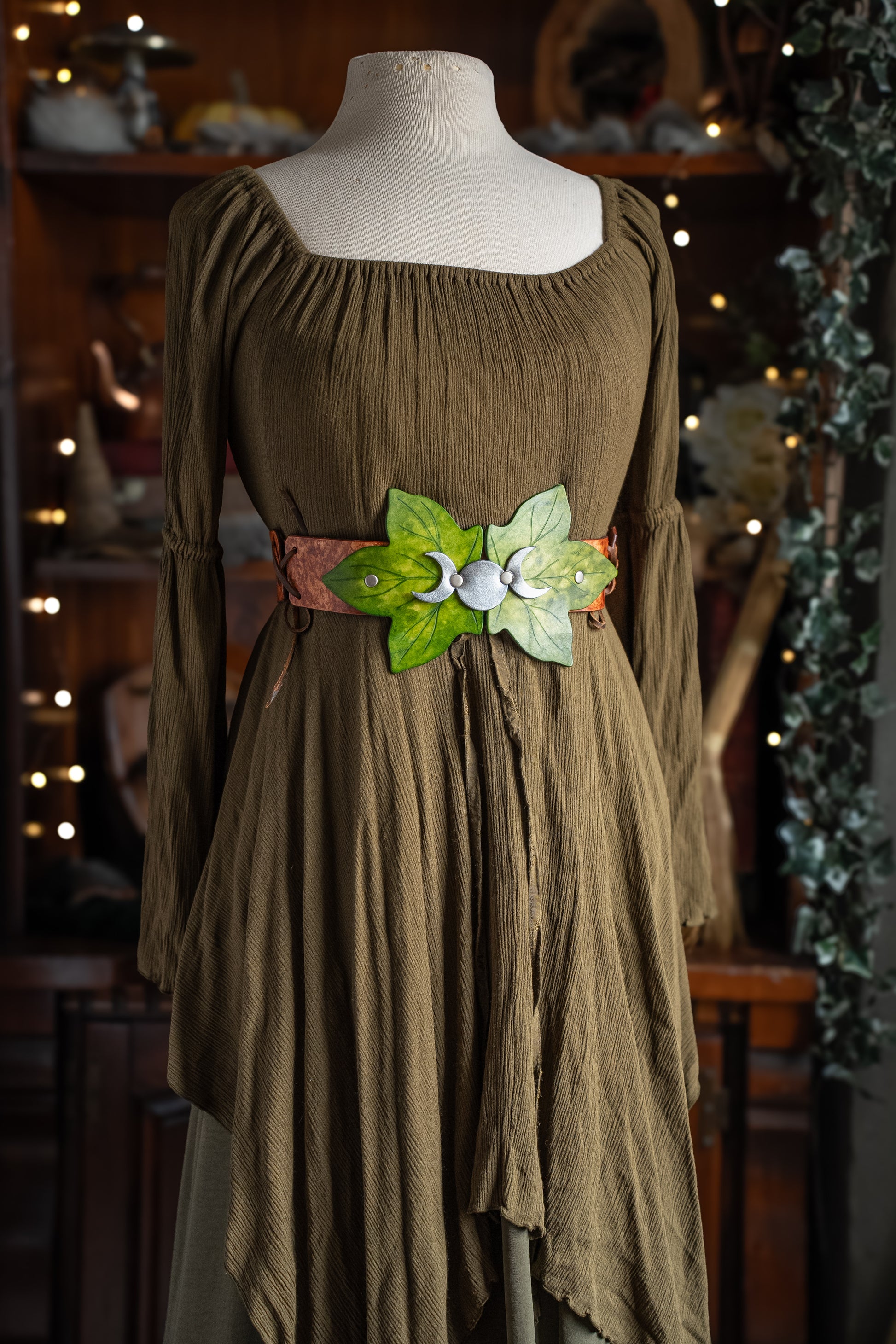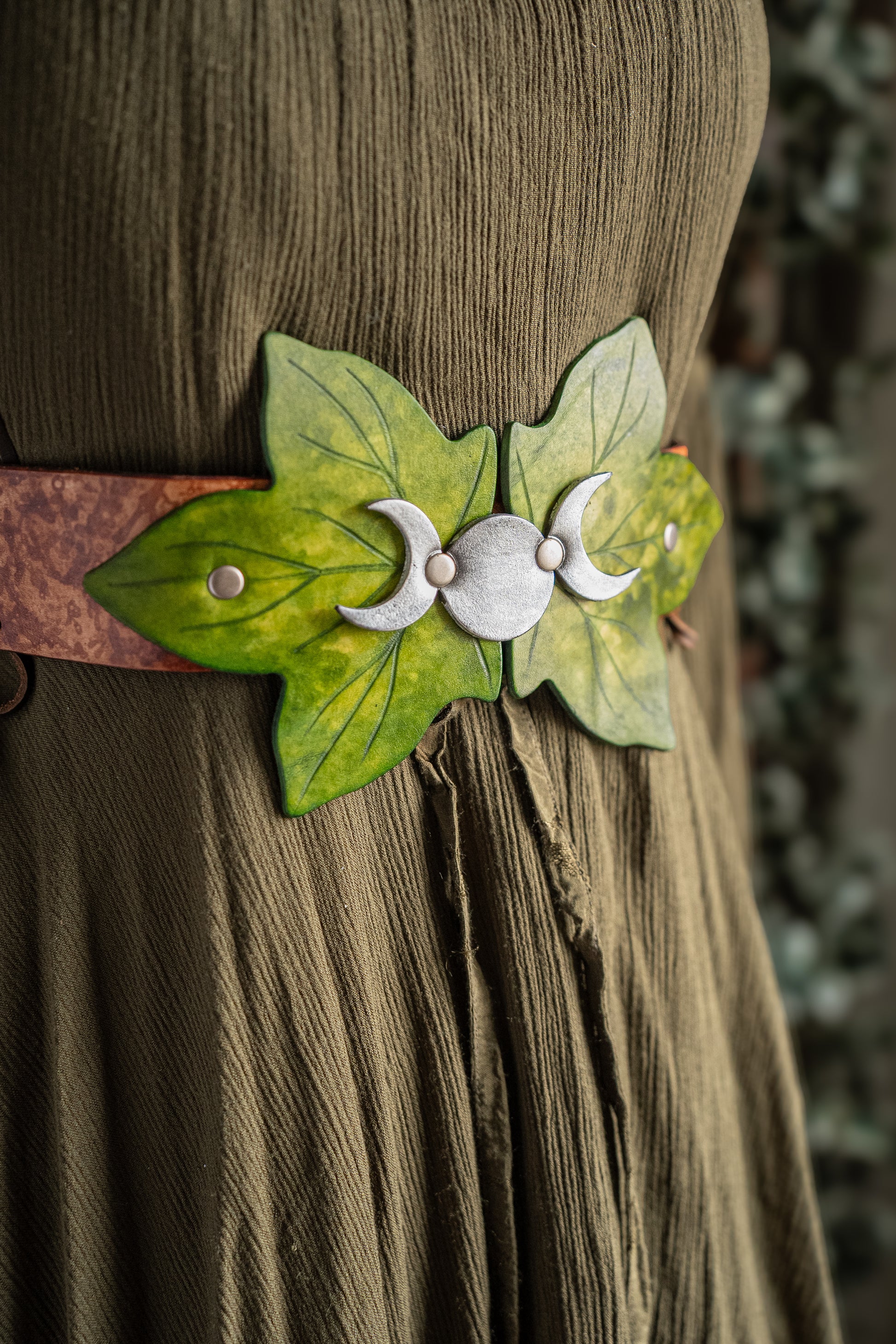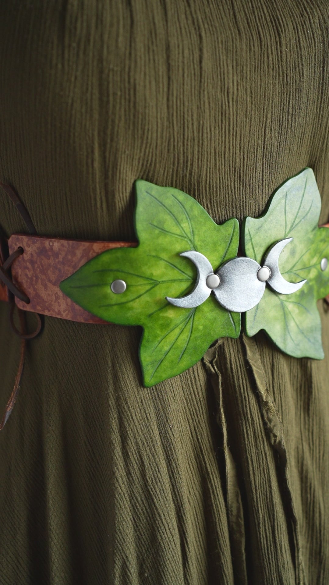 Cette ceinture est une belle combinaison de Fae et de Sorcière, avec une Triple Lune au centre, sur une paire de feuilles d'érable. Ajustable grâce à deux lacets de chaque côté, la ceinture sera dimensionnée sur mesure selon votre tour de taille.