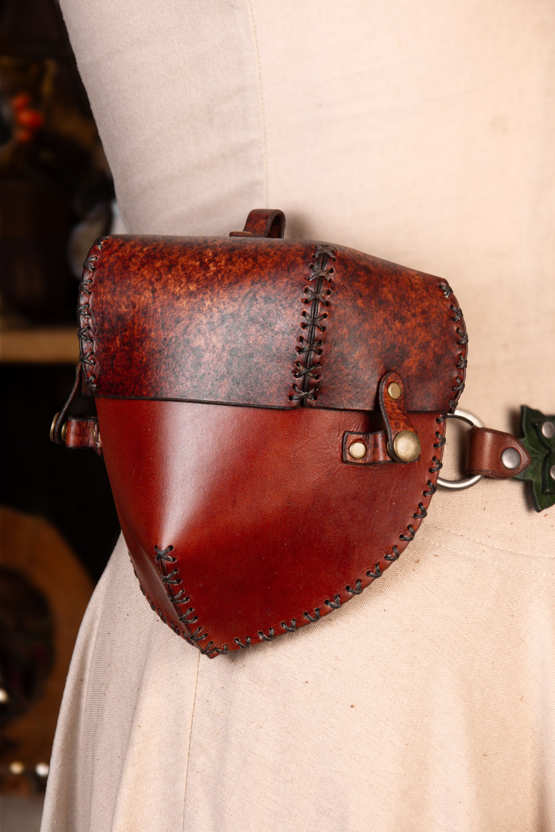 This little belt pouch is perfect for storing coins and trinkets, or even such strange items as cell phones or glasses. Measuring 6.25in x 6.5in x 2in, or roughly 16cm x 16.5cm x 5cm, it can hold most cell phones.