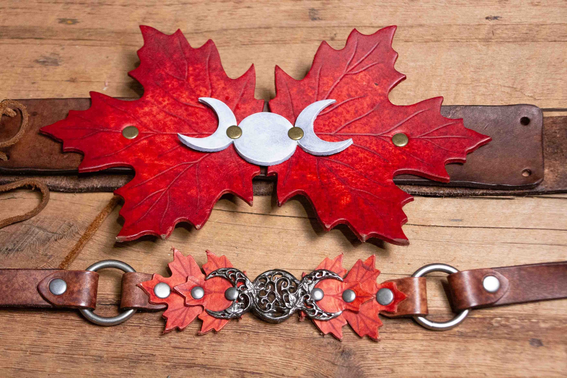 You can choose the colors of the leaves, the moons, the tabs around the ring, the belt color, and the metal color, to perfectly suit your taste. The buckle is meant to be worn in the back, with the triple moons and leaves in front. The belt is roughly 1.5" wide, and can even be used with pants. If you intend to wear at the hips, be sure to choose a size with a measurement matching your hips, rather than your waist.