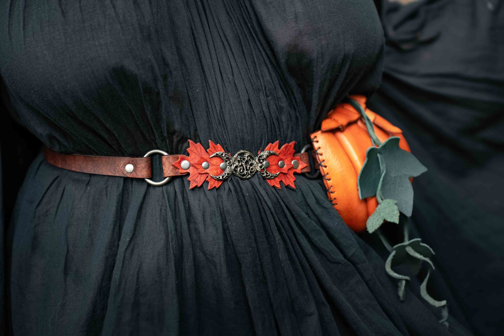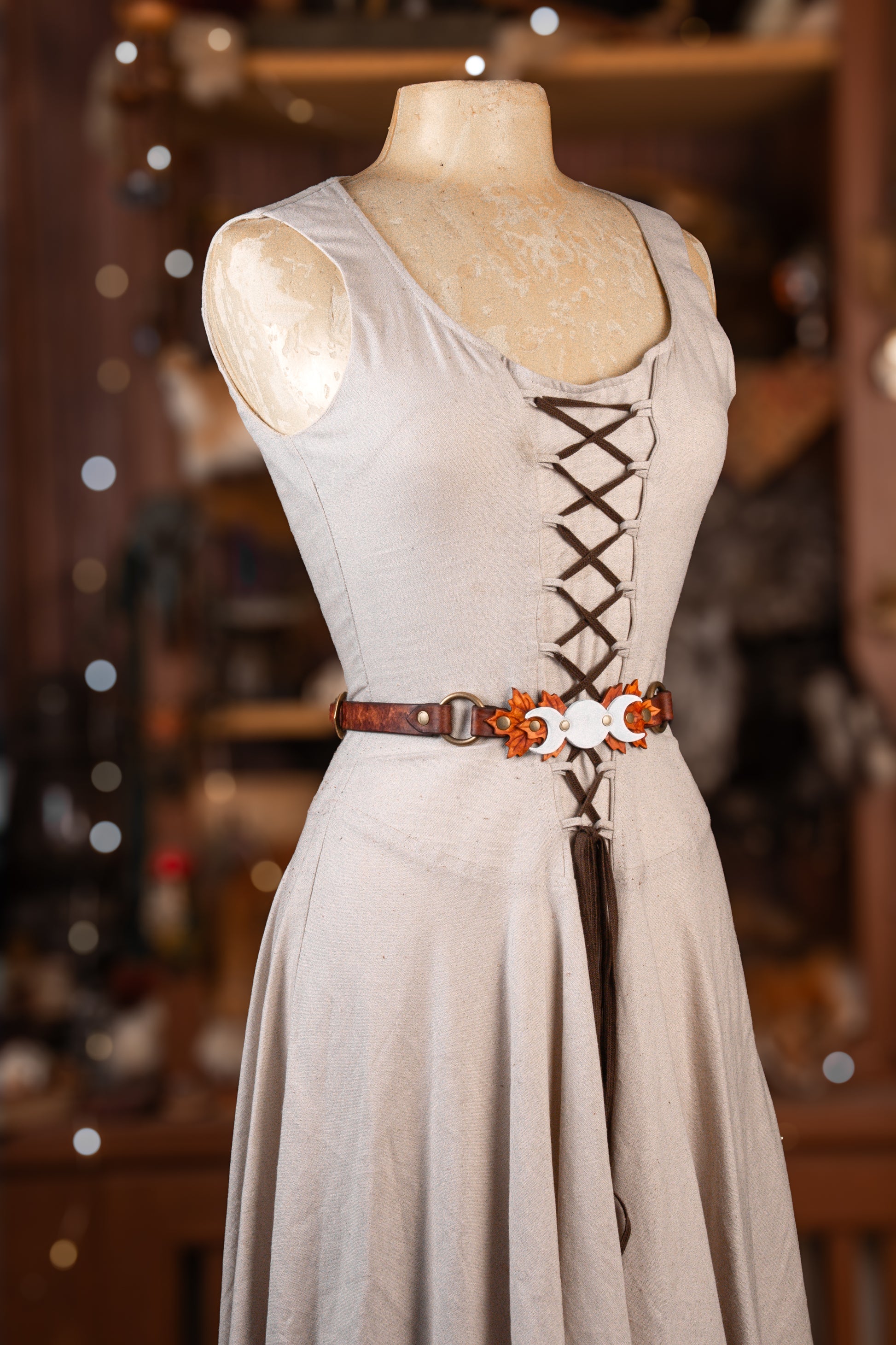 The buckle is meant to be worn in the back, with the triple moons and leaves in front. The belt is roughly 1.5" wide, and so can even be used with pants! If you intend to wear at the hips, be sure to choose a size with a measurement matching your hips, rather than your waist.