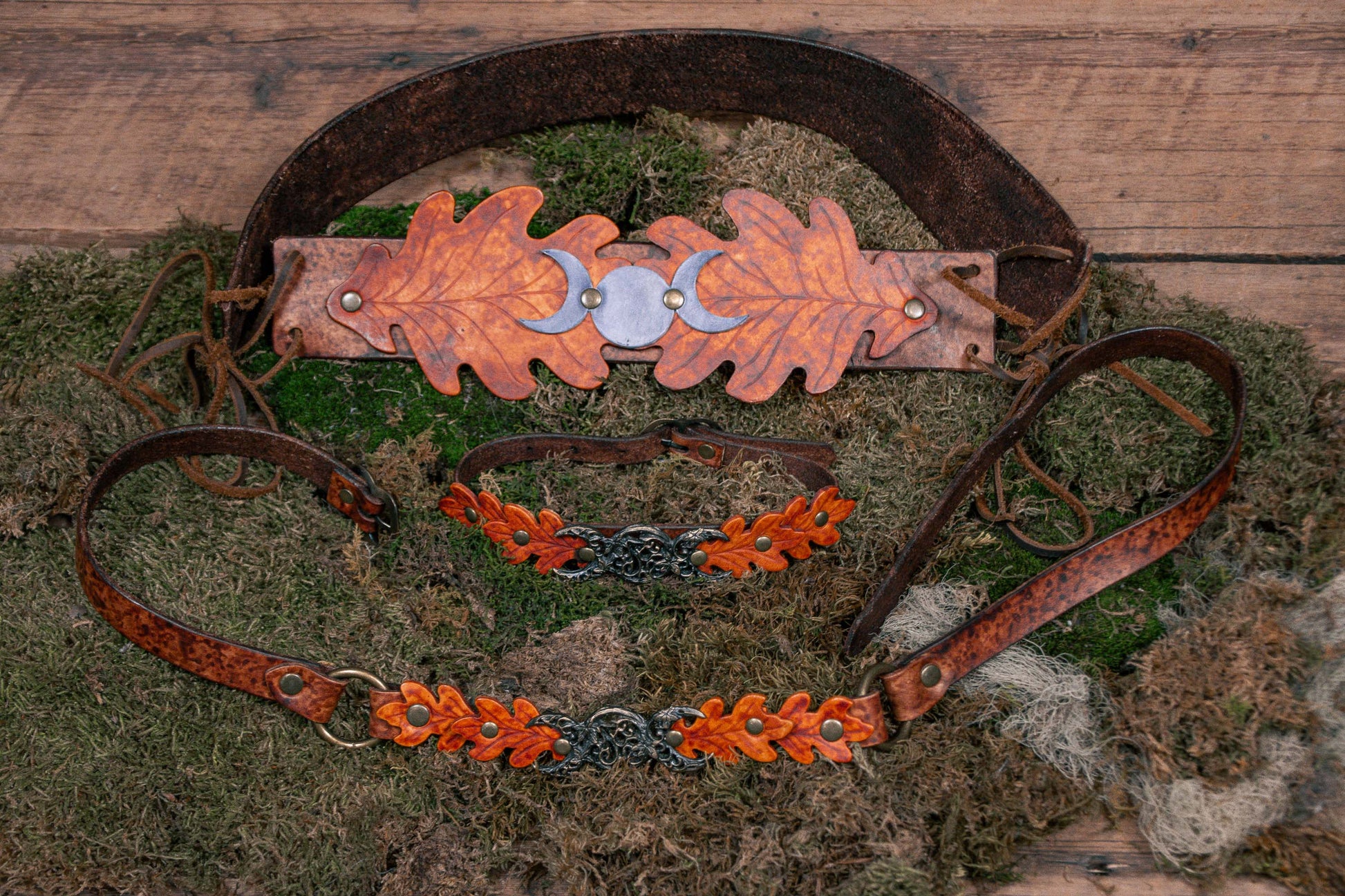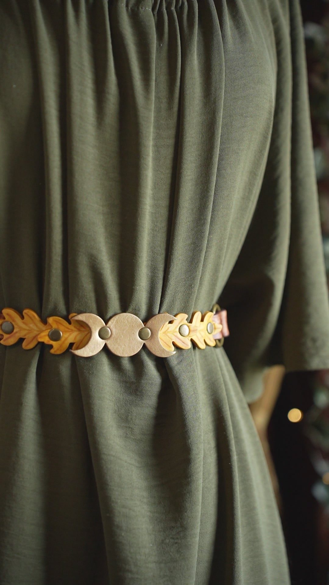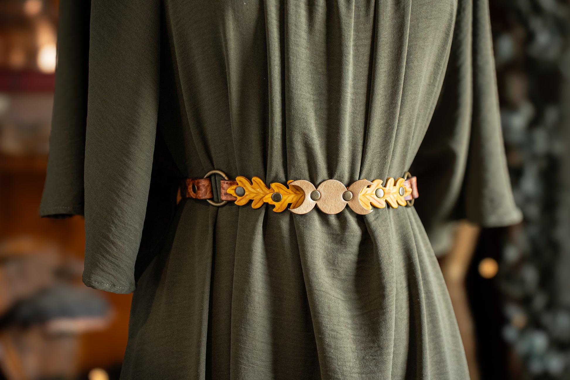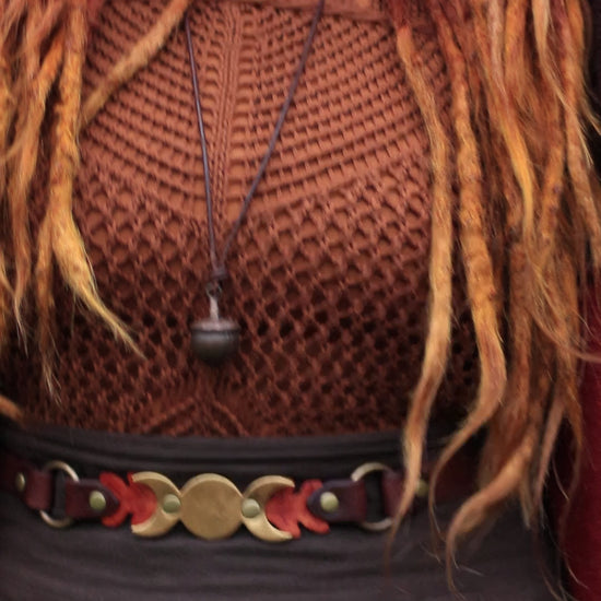 You can choose the colors of the leaves, the moons, the tabs around the ring, the belt color, and the metal color, to perfectly suit your taste. The buckle is meant to be worn in the back, with the triple moons and leaves in front. The belt is roughly 1.5" wide, and so can even be used with pants! If you intend to wear at the hips, be sure to choose a size with a measurement matching your hips, rather than your waist.