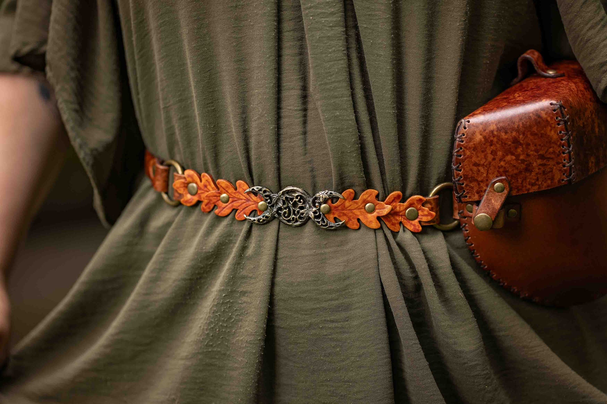 The buckle is meant to be worn in the back, with the triple moons and leaves in front. The belt is roughly 1.5" wide, and so can even be used with pants! If you intend to wear at the hips, be sure to choose a size with a measurement matching your hips, rather than your waist.