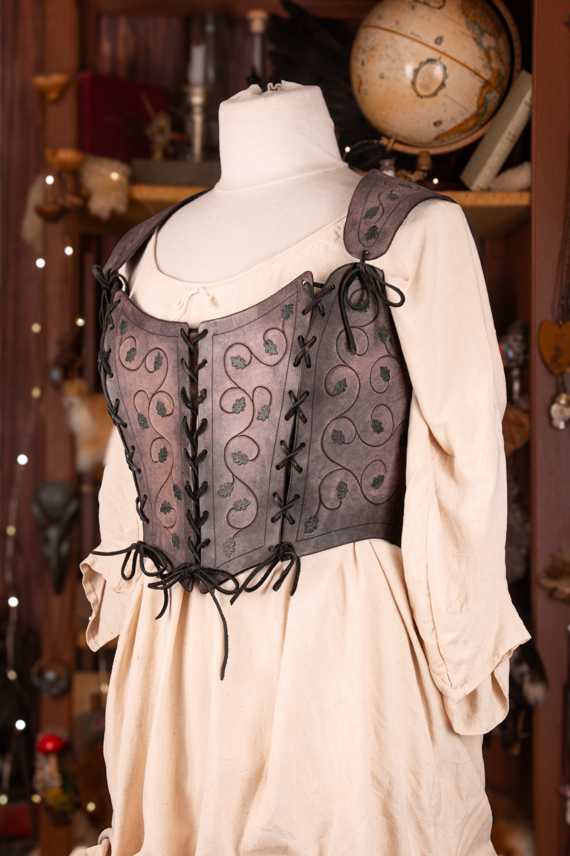 The laces between each panel make it very adjustable, and the thick leather gives a lot of support, without the need for any boning! Perfect for renaissance faires, medieval festivals, and LARPs.