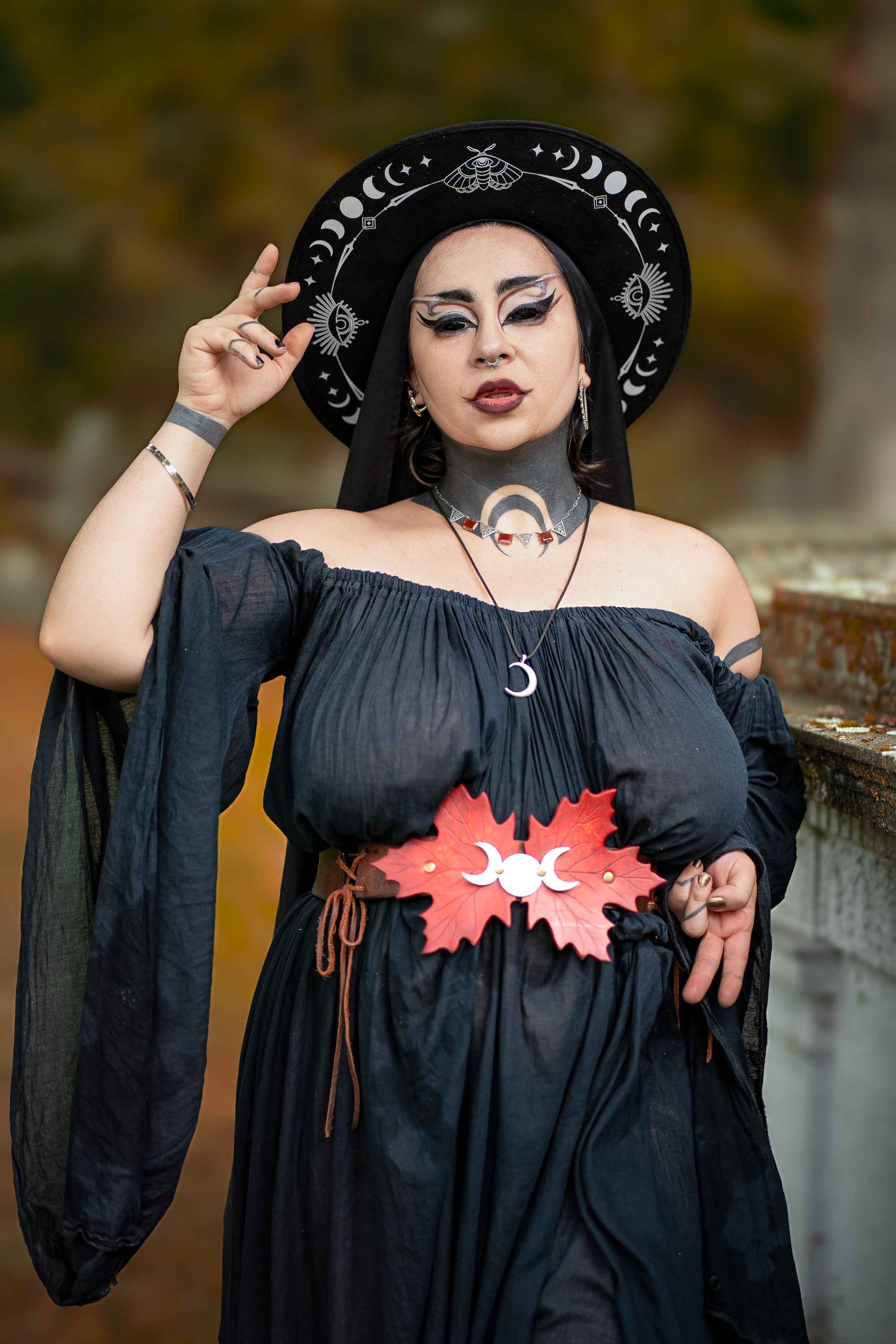 This belt is a beautiful combination of Fae and Witch, with a Triple Moon at the center, over a pair of oak leaves. Adjustable with two laces on either side, the belt will be custom sized to your waist measurement.