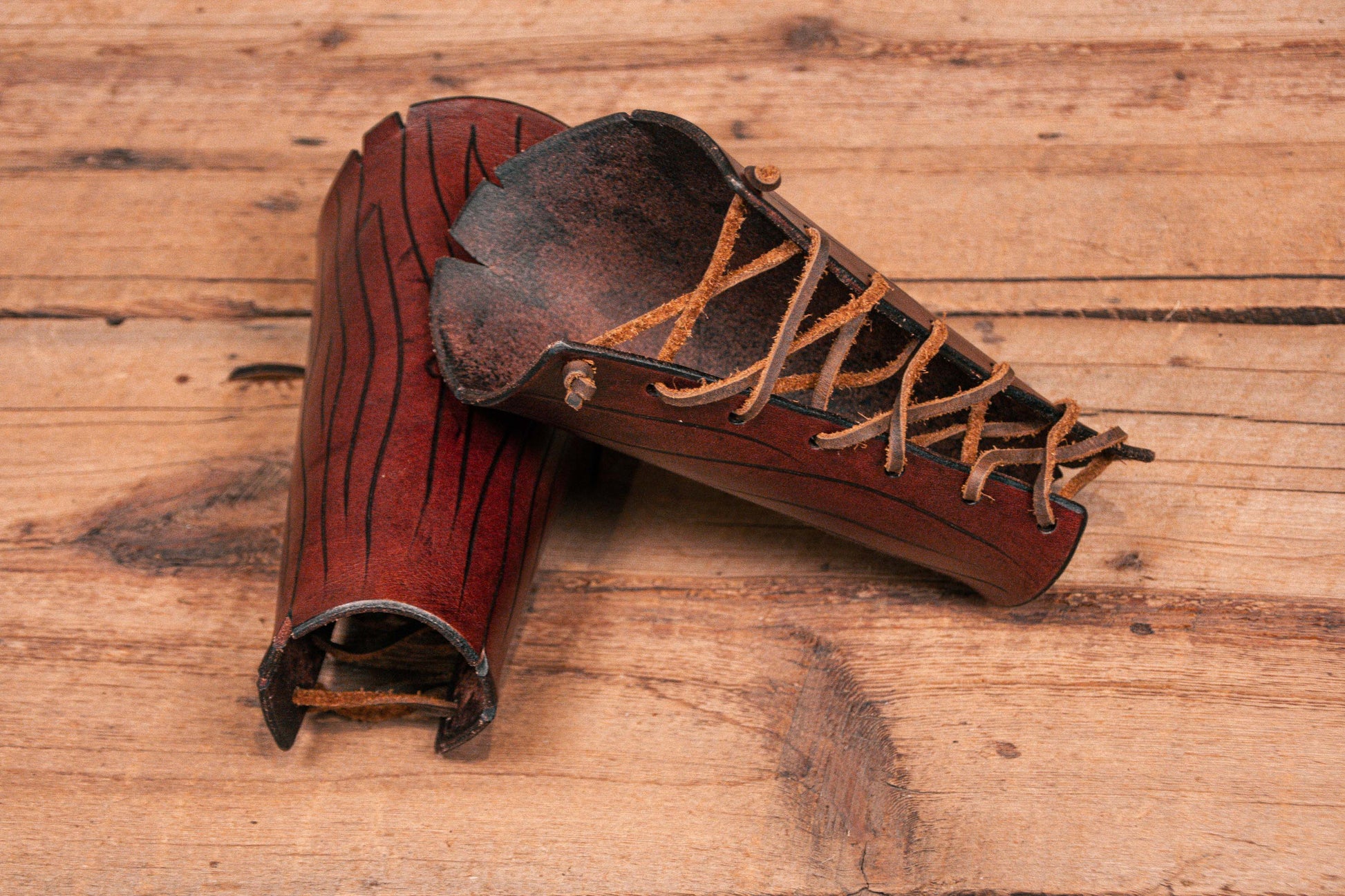 The bracers are sturdy, made with 1/8 to 1/4in thick leather, and is very adjustable, with leather lacing.