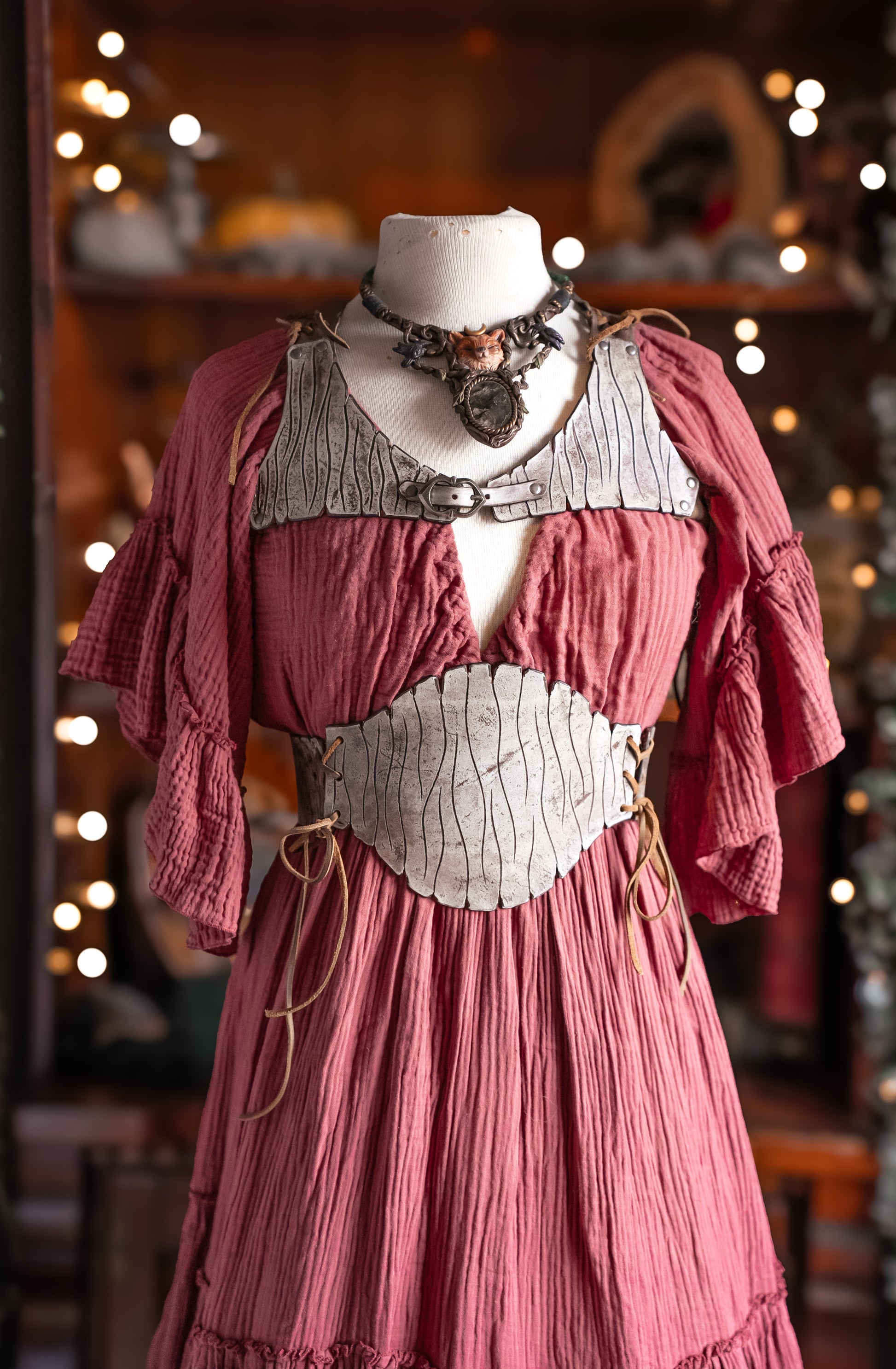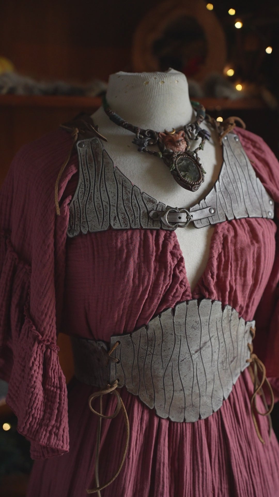This vest is sturdy, made with 1/8 to 1/4in thick leather on top of soft deerskin with adjustable laces on the shoulders and armpits.